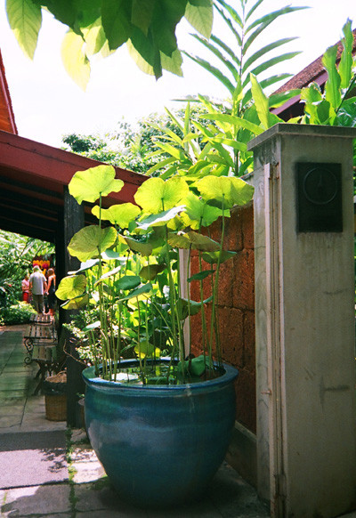 走在飯店餐廳路間,泰國人非常喜歡利用水缸來做園藝,蒔花種草養魚,大多種蓮花或些水生植物。悶熱的天氣中經過儲著一汪水的水缸的確很有降暑效果。