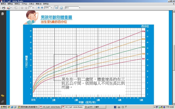 男生體重曲線表(假使寶寶現在約一歲,體重在十二公斤左右,表示他的成長百分比在97%,代表到二歲時體重可達十六七公斤左右。當然此數值只是統計,參考用,非標準數值。)